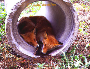 キタキツネ牧場で仲良く昼寝してました。私は小学生の頃映画キタキツネ物語を見てから大のキツネファン。初めて北海道に来たときも車道に出てくるキツネを見ては車を止め、又車を止め・・・てましたが、あまりの頻繁さにさすがに最近は無視してます。が、食べ物を欲しがるあの一途な瞳には心が動いてしまう。野性なのに・・・