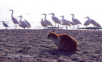 琵琶湖畔に集まる鷺を見つめるネコ。まさか追っかけるつもりでもないだろうけど、意味深な後姿・・・