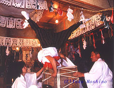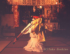 神楽は33番から構成され、地域によって順番や内容が少しづつ異なります。 一番の目玉は明け方に奉納される、天照大神が隠れられた天岩戸の前で、天ノウズメノ命が踊り、手力雄命が戸をこじ開ける場面ですが、その他にも33番の中には、面白い踊りが盛りだくさん。中には刀を持って踊ったり、アクロバット的な踊りもあります。 |