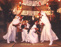 円になって踊ります。 一人減り二人減り、最後には一人になって、 日本刀を持ったまま、でんぐり返りをしたり、かなり危険な踊りです。 21世紀旅日記 Copyright (C) 2004 Yuka Hoshino |