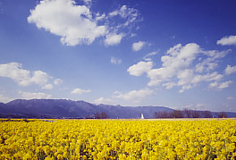 1月下旬〜2月下旬、守山の琵琶湖畔では菜の花が咲く。西側にビルがあり夕方菜の花畑に影を落とすのでそれまでに訪れたほうが良い。