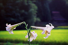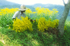 夏、越畑では女郎花(おみなえし)の花が栽培される。お盆の出荷に向けて、農家の方が摘んだ花を束ねている姿も暑そうだ。(おみなえし7/9〜8/4頃、栽培のため年によって違うらしい)