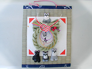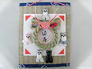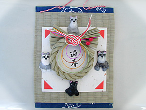 | <ニューイヤー しめ縄シュナ4> 外寸:縦16cmx横20cm 紐立ち上がり部分:約5cm 布、紙、い草他の壁掛けタイプ、 シュナちゃん以外は市販のものを使用しています 4種類のカラーのシュナちゃんが集まったよ♪♪ シュナちゃん入れ替えなしという事でお得に↓させて頂きました・・(^-^) なお、位置はご希望をお知らせください!! 各1500yen(送料別) |