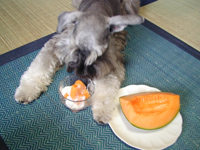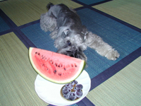 2003.09.14 やったぁ〜っ、すいかだ〜っ☆ 横目で見てたけど、 ボクね、我慢出来ない・・♪ 10日位前から売ってなくて、 次は来年かなって思ってたから 大喜びなんだo(^-^)o この巨峰は全部ボクの分だって、 ホントかなぁ?! |