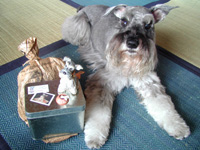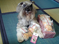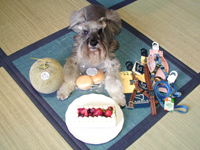 | 2003.10.14 ボクは10歳6ヶ月♪ それにね、HP開設2周年の お祝いしてるんだぁ〜(^o^)v ハーネス&リード2セットと 北海道味覚三昧シリーズ♪ 7種のベリーがトッピングされた レアチーズケーキ・・ 江別「ベイクドアルル」さんの 「雪の果実」・・ ぺろ〜りして怒られちゃったぁ! えへへっ、ベリーはもらったよ♪ |