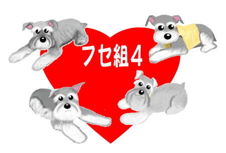 | フセバージョン・フセ組4 桃ちゃん・アンジェちゃん ティキ・ジンジャー君 ユニットを組んだ4シュナ・・ それにしてもみんなそっくりでかっわいいわぁ〜ん♪ |