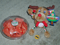 | すいか&トナカイおもちゃ &JOKER迷子札 メリークリスマス☆ ボクはまず、すいかに一目散(^o^) この時期珍しいので、感激♪ 東京のおみやげもありがとう!! |