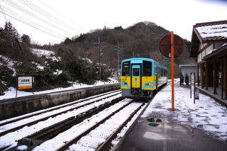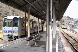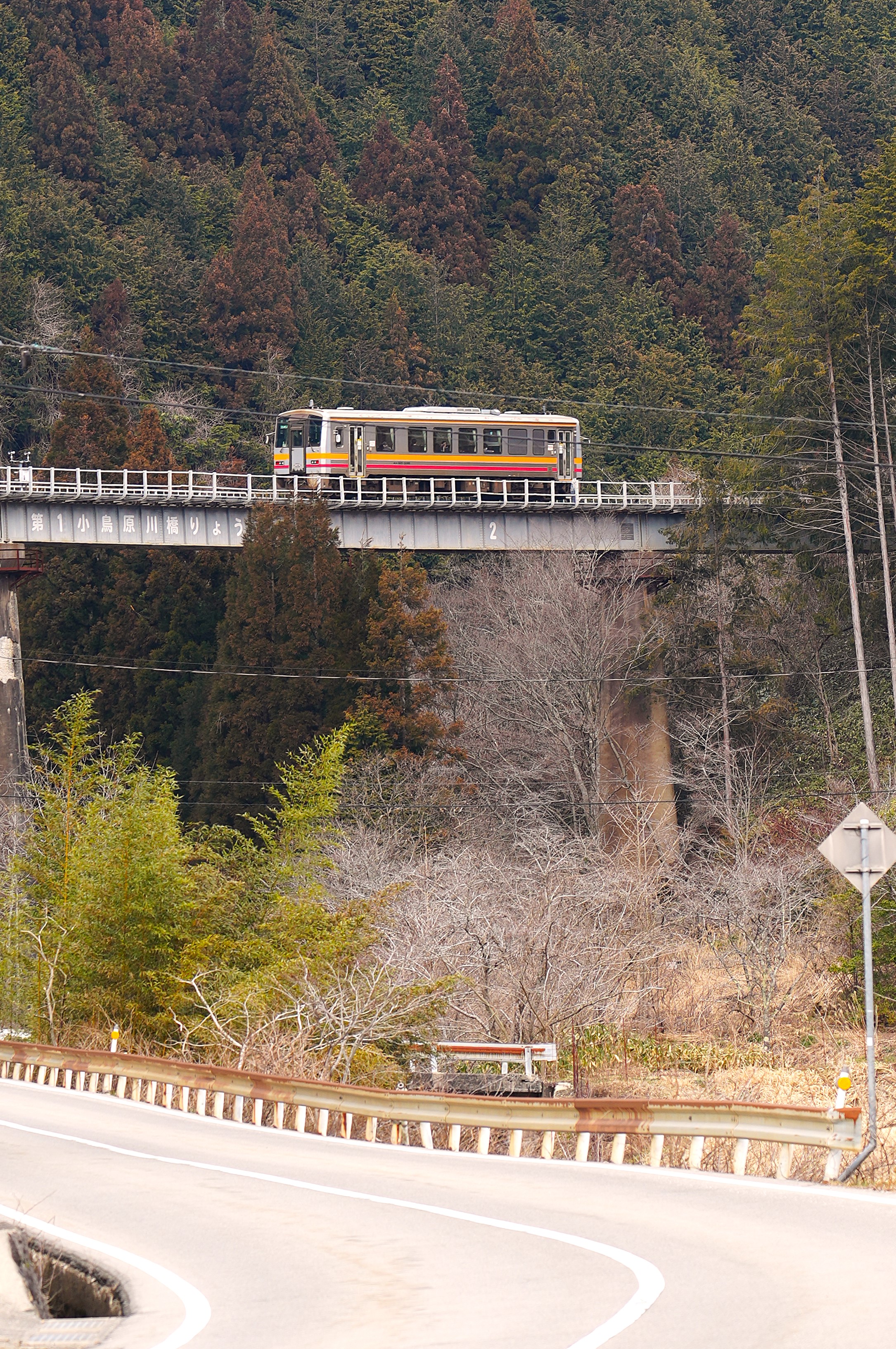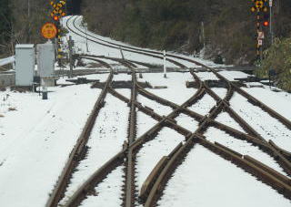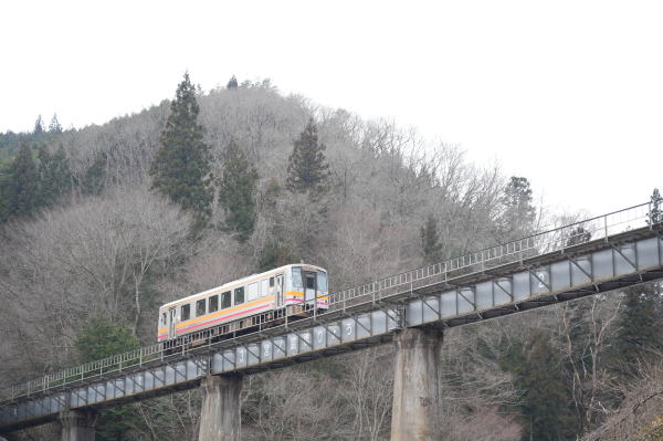 | 山間部では雪が残っており、線路わきの樹木の枝がときおり車体を擦る音や制限速度25㎞の区間、そして第四種踏切に近づくと鳴らす警笛など、典型的なローカル線の風情が感じられた路線でした。 |