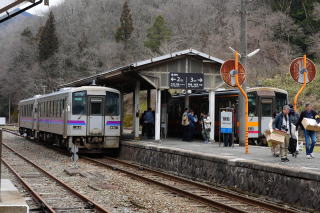 また、松本清張の小説「砂の器」に登場する亀嵩駅をはじめ、神話に出てくる神様の名前がつけられた駅たち、さらに「おろちループ」と呼ばれる雄大な道路橋といった見どころが多く、それらを堪能しながら、キハ120に揺られること3時間ほどで備後落合に到着。 |