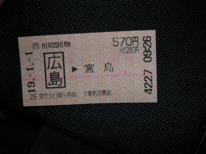 | 飛行機は定刻に広島到着、バスにて市街地へ。 今回事前調査とか全然してなかったから、 頼りになるのは自分の感と現地の薄い地図のみ。 最近本当ガイドブックを買わないなぁ〜。 現地に着けば現地のインフォメーションセンターへ。 一枚の地図と、行きたい場所のパンフのみをもらい、 後はそこまでどう行くかを携帯のサイトで検索。 自分でも驚くほどしっくり来る。旅はハイテクの時代です。 広島に着いてすぐに駅へ直行! 宮島のフェリー代が含まれた切符を買い、 下関行きの快速に飛び乗る!! 飛行場から宮島までおよそ1時間、 遂に神居つく島;厳島神社へと辿り着きました。 |