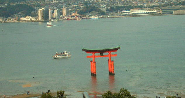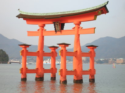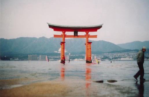 | 海から見る鳥居も綺麗だけど、 近くから見ると更にその美しさが映えるのが宮島の大鳥居。 上は朝の満潮の時間なので水が滴っていますが、 午後干潮になると何とこの鳥居の下を歩けます。 自然の神秘を見事に生活に取り入れた先人達。 これを見た昔の参拝者は、神の導きを信じたくもなったでしょう。 (下が銀塩で撮った干潮時の大鳥居。) |
