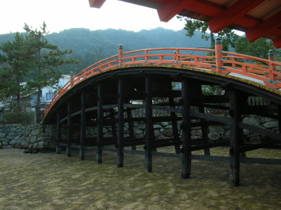 | 厳島の合戦の際、火事で消失しかけた橋。 毛利元就の元、現在の形に復元されたそうです。 合戦の最中火を掛けて落ち延びる敵方の大将を捨ておき、 厳島の文化遺産を守る事を命じたと言うのだから 人間としての器の大きさを感じさせます。 |