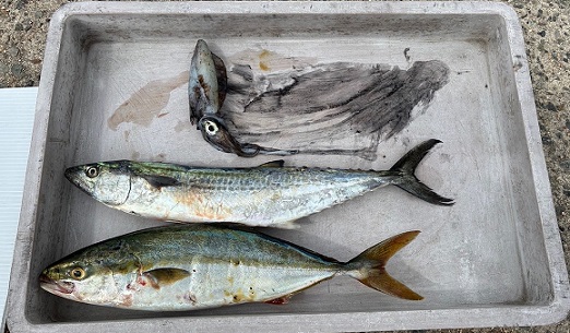 ショアジギング・エギング 谷川さん夫妻 45pのサゴシ 〜15pまでのアオリイカが6杯 釣れました お二人仲良く狙い通りの アオリイカ・サゴシgetです(^O^)/ |