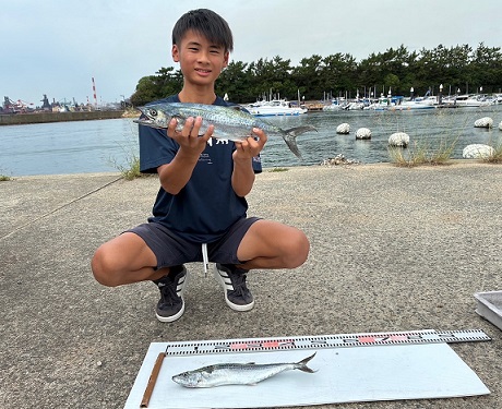 ショアジギング 清水さん親子 48pまでのサゴシ2本釣れました 息子さん、見事にサゴシを 釣ってくれました!(^^)! |