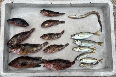 Iさん 21pのアコウ 14〜20pのガシラ8匹 アジ10〜15pが5匹・アナゴ シマイサギが釣れました アジも少しずつ大きくなってますね アコウも釣れて良かったです(*^^*) |