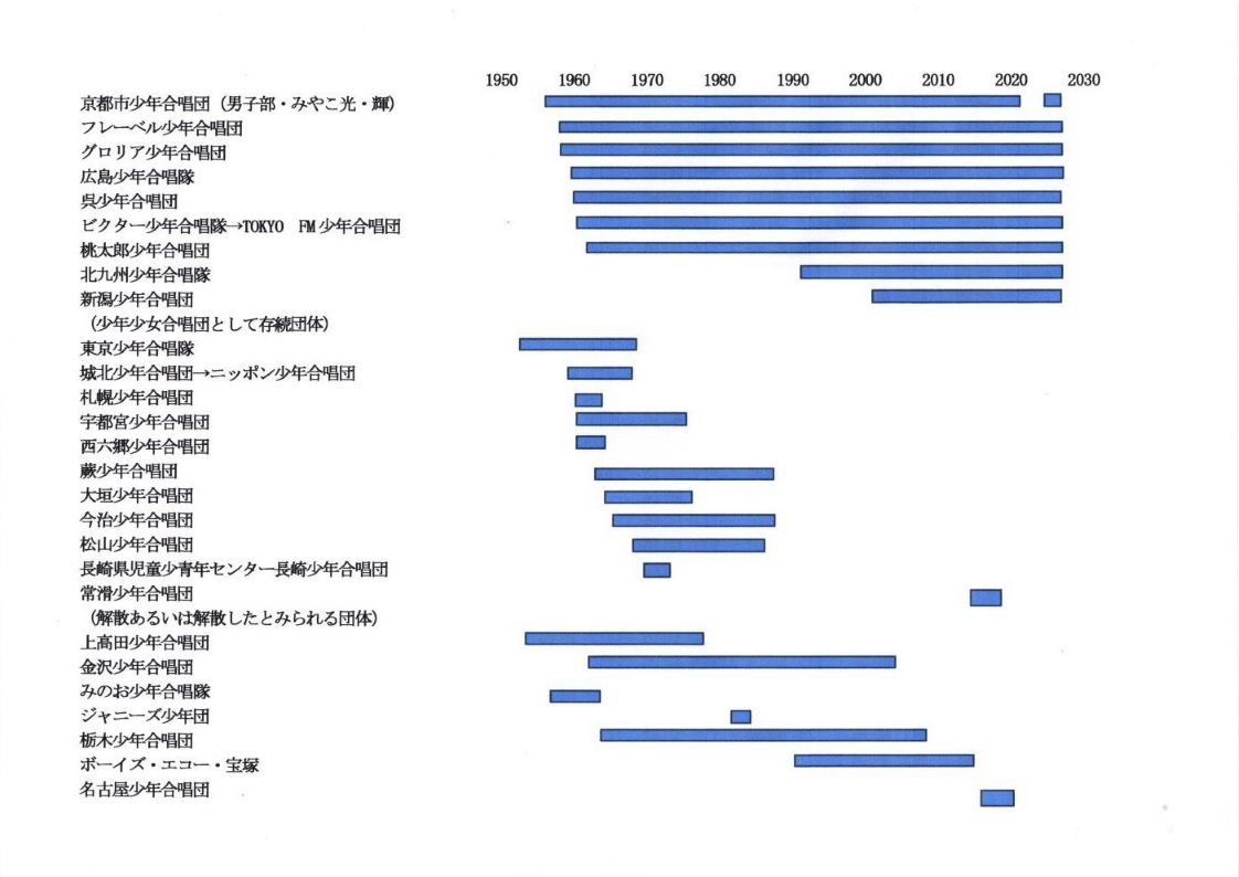 グロリア少年合唱団 | 新潟少年合唱団 | 京都市少年合唱団 輝(ひかり) | 和歌山児童合唱団 少年の部 (現在活動していない) | ボーイズ・エコー・宝塚(休団) |